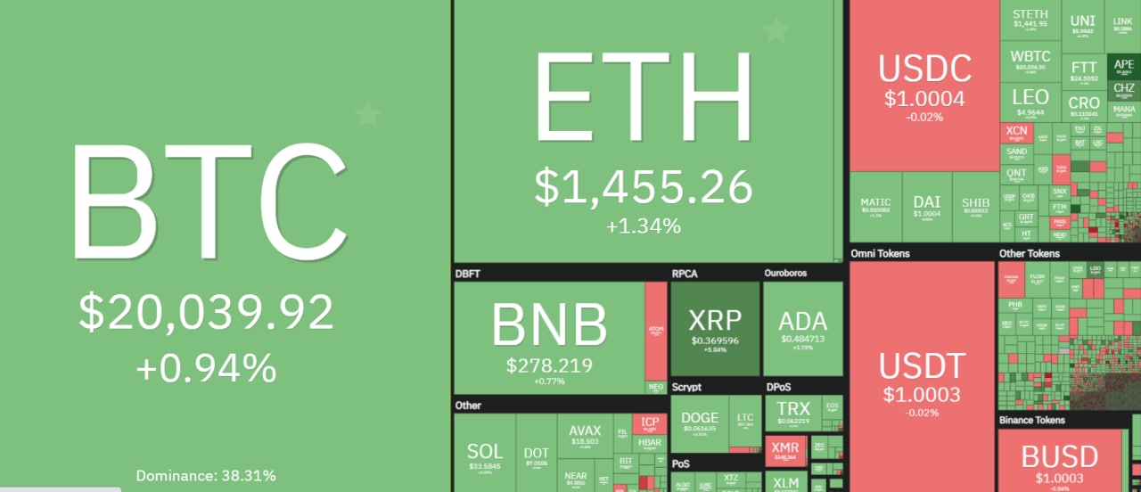 بیتکوین با رشد حدود ۱ درصد به قیمت ۲۰ هزار و ۳۹ دلار و اتریوم با افزایش بیش از ۱ درصد به قیمت هزار و ۴۵۵ دلار معامله میشوند.