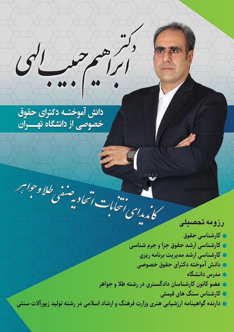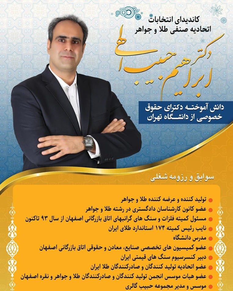 ابراهیم حبیب الهی کاندیدای انتخابات اتحادیه طلا و جواهر اصفهان در مصاحبه اختصاصی با سایت طلا گفت:دارای مدرک دکتری حقوق خصوصی از دانشگاه تهران، کارشناس دادگستری اصفهان در رشته طلا جواهر ،تولید کننده و عرضه کننده طلا و جواهر که در حدود 24 سال است در این صنف مشغول به فعالیت هستم.
