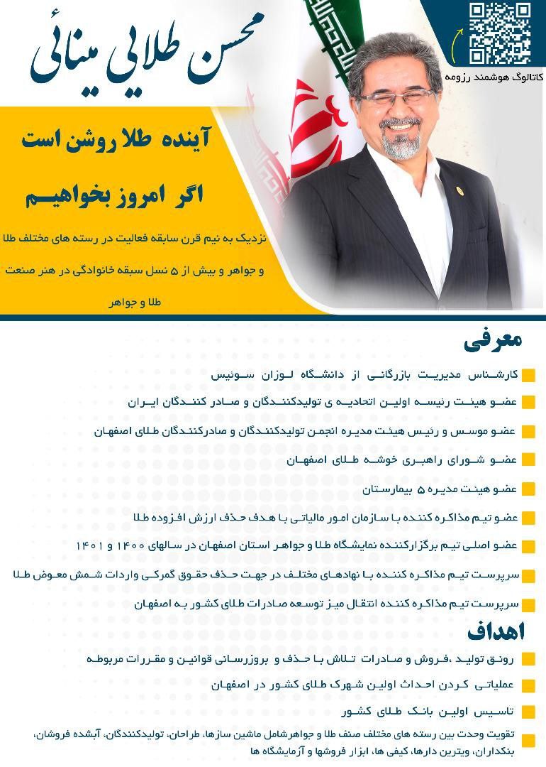 محسن طلامینائی کاندیدای انتخابات اتحادیه طلا و جواهر اصفهان گفت: دارای مدرک کارشناسی مدیریت بازرگانی از دانشگاه لوزان سوئیس می باشد.