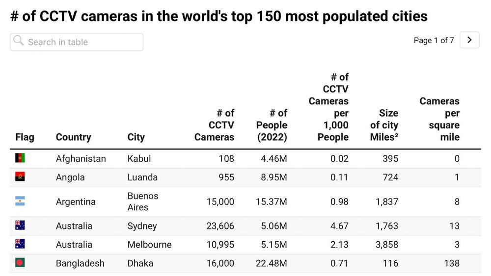 محققان Comparitech تعدادی منابع داده و گزارشها، از جمله گزارشهای دولتی، وبسایتهای پلیس و مقالات خبری را گردآوری کردند تا تصوری از تعداد دوربینهای مداربسته مورد استفاده در ۱۵۰ شهر بزرگ در سراسر جهان به دست آورند.