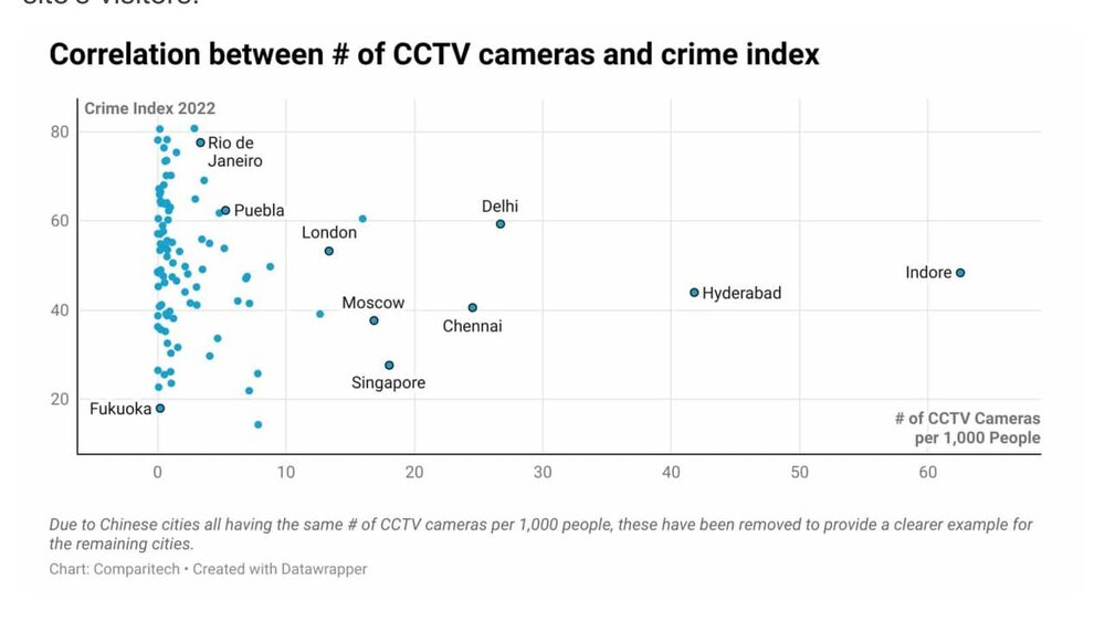 دهلی، چنای، سنگاپور، سئول، مسکو، لندن، نیویورک، حیدرآباد، بمبئی و مکزیکو سیتی(بر اساس تعداد دوربین در هر مایل مربع) ۱۰ شهر برتر خارج از چین هستند که تحت نظارت هستند.