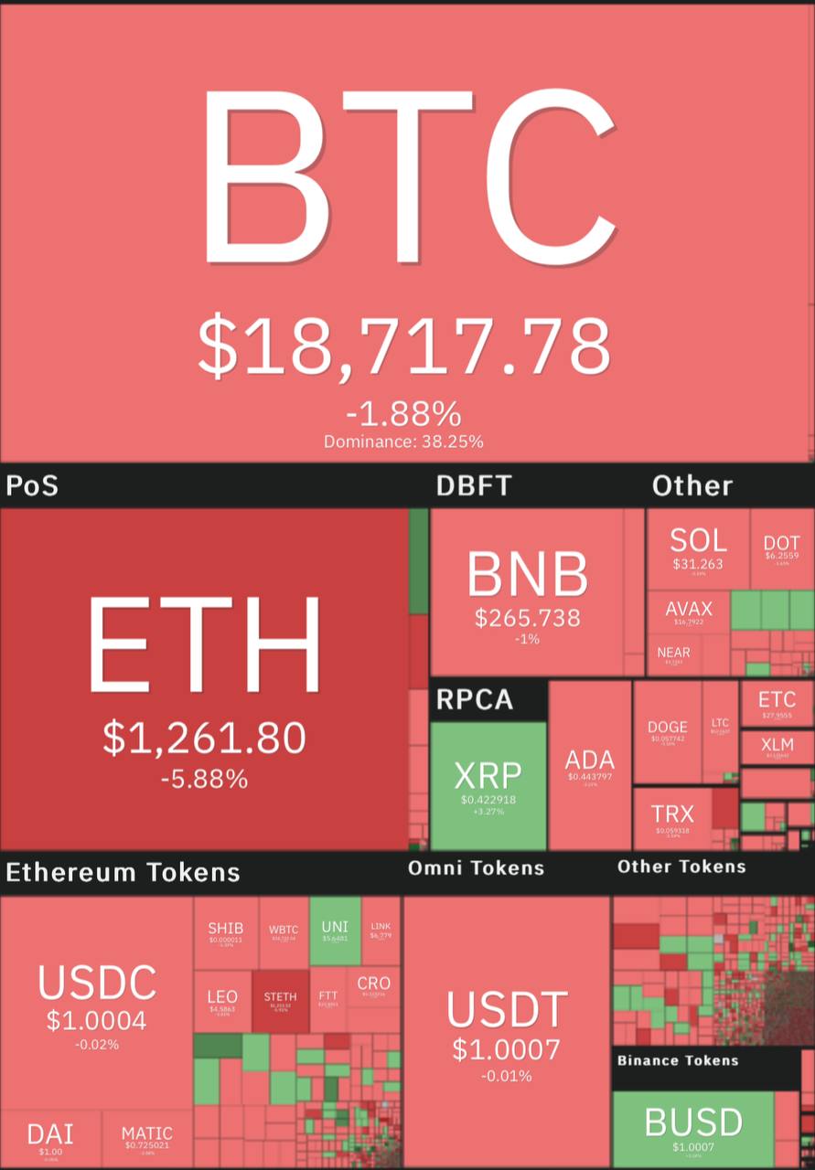 بیتکوین با افت حدود ۲ درصد به قیمت ۱۸ هزار و ۷۱۷ دلار و اتریوم با ریزش حدود ۶ درصد به قیمت هزار و ۲۶۱ دلار معامله میشوند.