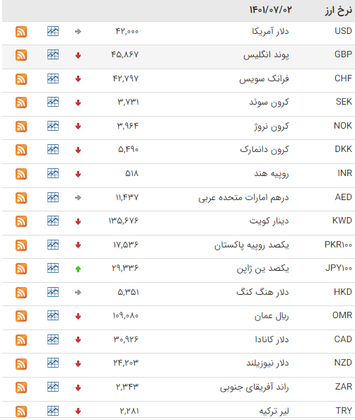 بانک مرکزی امروز شنبه (۲ مهر)، نرخ هر دلار را ۴۲ هزار ریال، پوند را ۴۵ هزار و ۸۶۷ و یورو را ۴۰ هزار و ۸۸۲ ریال اعلام کرد.