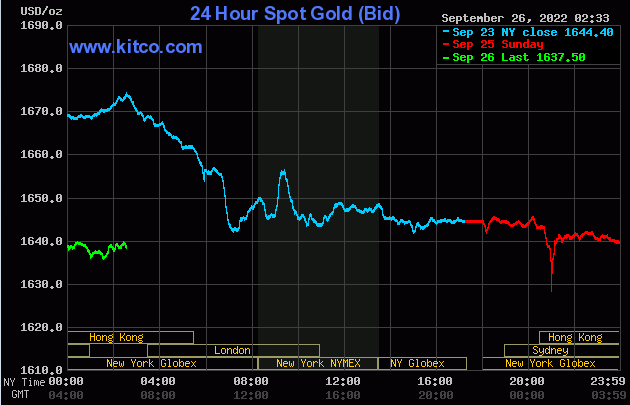 بهای هر اونس طلا در لحظه نگارش این خبر با ۴.۶ درصد کاهش به ۱۶۳8 دلار رسید.