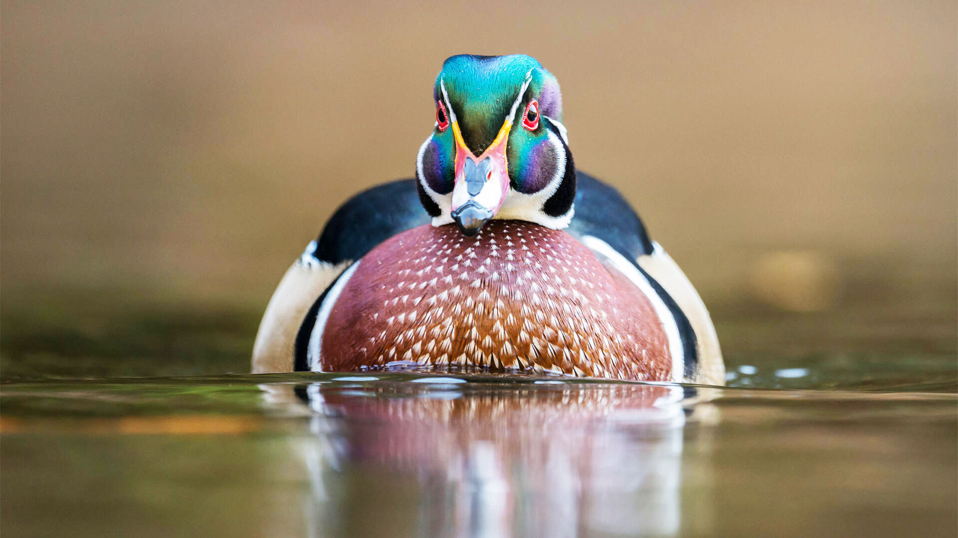 اردک چوبی احتمالاً رنگارنگ ترین پرنده آبی در جهان است. پرنده نر دارای سر و تاج فلزی و سبز مایل به ارغوانی است. شکم آنها سفید و سینه آنها قرمز تیره است. در امتداد گردن، نوارهای سفید و جذاب و باریکی دارند. بال های آنها به رنگ آبی و مشکی طرح دار است.