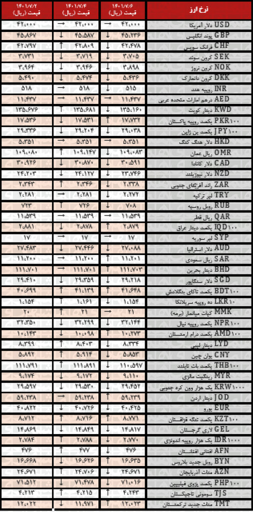 بانک مرکزی امروز نرخ هر دلار را ۴۲ هزار ریال، پوند را ۴۵ هزار و ۲۳۶ و یورو را ۴۰ هزار و ۴۲۵ ریال اعلام کرد.