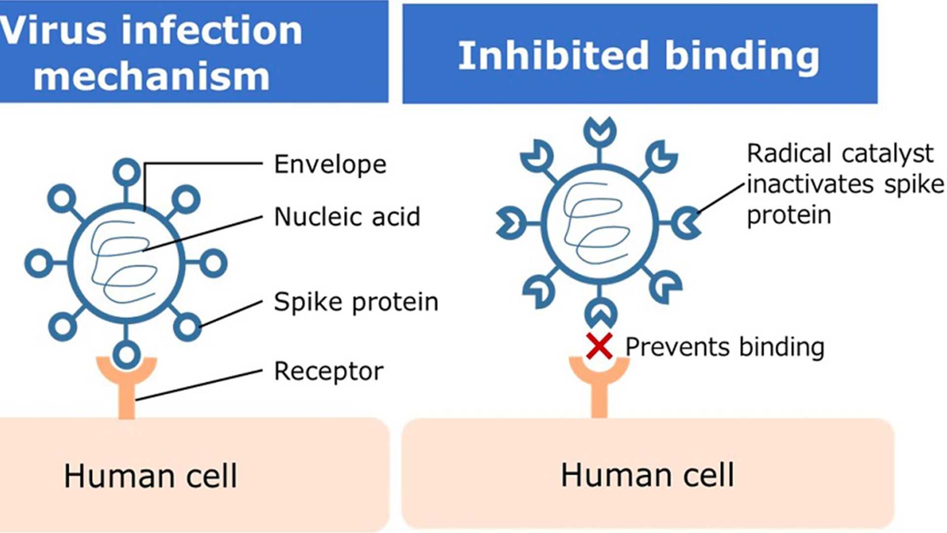 در مورد ویروسها، کاتالیستهای رادیکال با اکسید کردن اجزای ارگانیک باعث غیرفعال شدن آنها میشوند. به عبارت دقیقتر، کاتالیستها با غیرفعال کردن گیرنده پروتئینی، جلوی چسبیدن ویروس به سلول انسان را میگیرند.