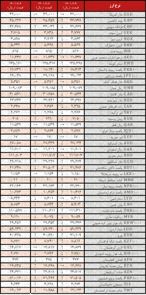 بانک مرکزی امروز، شنبه (۹ مهر)، نرخ رسمی ۴۶ ارز را اعلام کرد که بر اساس آن نرخ ۲۱ ارز افزایش و نرخ ۱۶ ارز کاهش یافت.