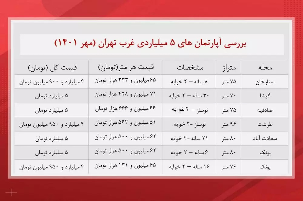 همچنین واحد آپارتمانی ۸۰ متری در محله پونک با توجه به اینکه ۶ سال از ساخت آن میگذرد و ۳ اتاق خواب دارد، در روز های گذشته معادل ۵ میلیارد تومان قیمتگذاری شده است.
