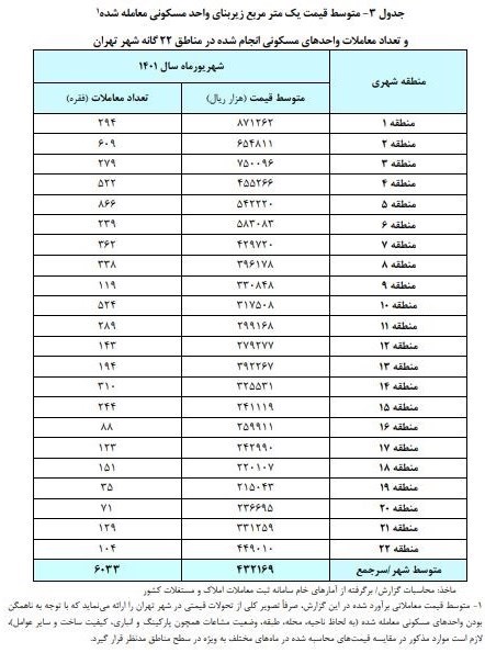 در میان مناطق 22گانه شهرداری تهران، بیشترین متوسط قیمت یک متر مربع زیربنای مسکونی معامله شده معادل 871.3 میلیون ریال به منطقه 1 و کمترین آن با 215 میلیون ریال به منطقه 19 تعلق داشته است. ارقام مزبور نسبت به ماه مشابه سال 1400 به ترتیب 26.4 و 18.8 درصد افزایش نشان میدهند.
