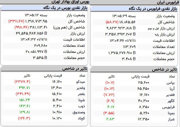 فرابورس ایران (فرابورس)، پالایش نفت شیراز (شراز)، صنعتی بهپاک (بهپاک)، سیان لار سبزوار (سبزوا)، پویا زرکان آق دره (فزر)، بیمه سامان (بساما) تاثیر مثبت بر شاخص فرابورس همراه بودند و همچنین بیمه پاسارگاد (بپاس)، پلیمر آریا ساسول (آریا)، آهن و فولاد غدیر ایرانیان (فغدیر)، سنگ آهن گهرزمین (کگهر)، تولید و برق عسلویه مپنا (بمپنا)، صنعتی مینو (غصینو)، صنایع مادیران (مادیرا) تاثیر منفی بر این شاخص داشتند.