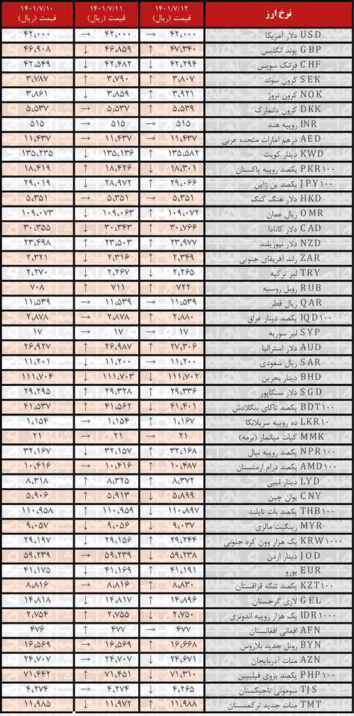 بانک مرکزی امروز نرخ هر دلار را ۴۲ هزار ریال، پوند را ۴۷ هزار و ۳۴۰ و یورو را ۴۱ هزار و ۱۹۱ ریال اعلام کرد.