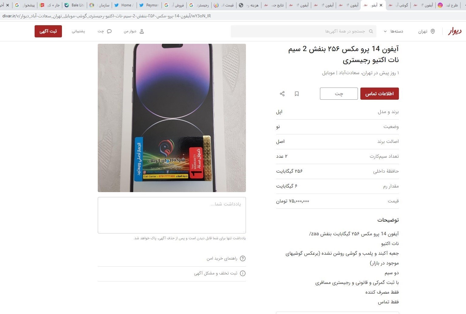 در یکی از آگهیهای فروش آیفون14 در فضای مجازی، چنین توضیحی آورده شده است: