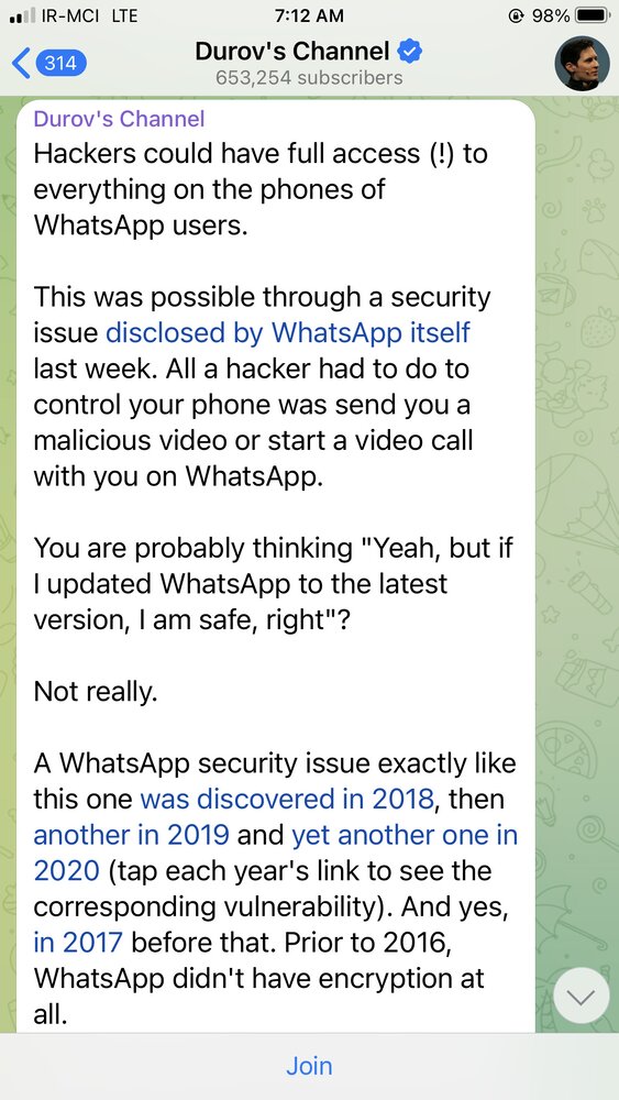 من اینجا به مردم فشار نمیآورم که به تلگرام بروند. با بیش از 700 میلیون کاربر فعال و بیش از 2 میلیون ثبت نام روزانه، تلگرام نیازی به تبلیغات اضافی ندارد. میتوانید از هر برنامه پیامرسانی که دوست دارید استفاده کنید، اما از واتساپ دوری کنید - اکنون واتس اپ 14 سال است که به عنوان یک ابزار نظارتی استفاده می شود!.