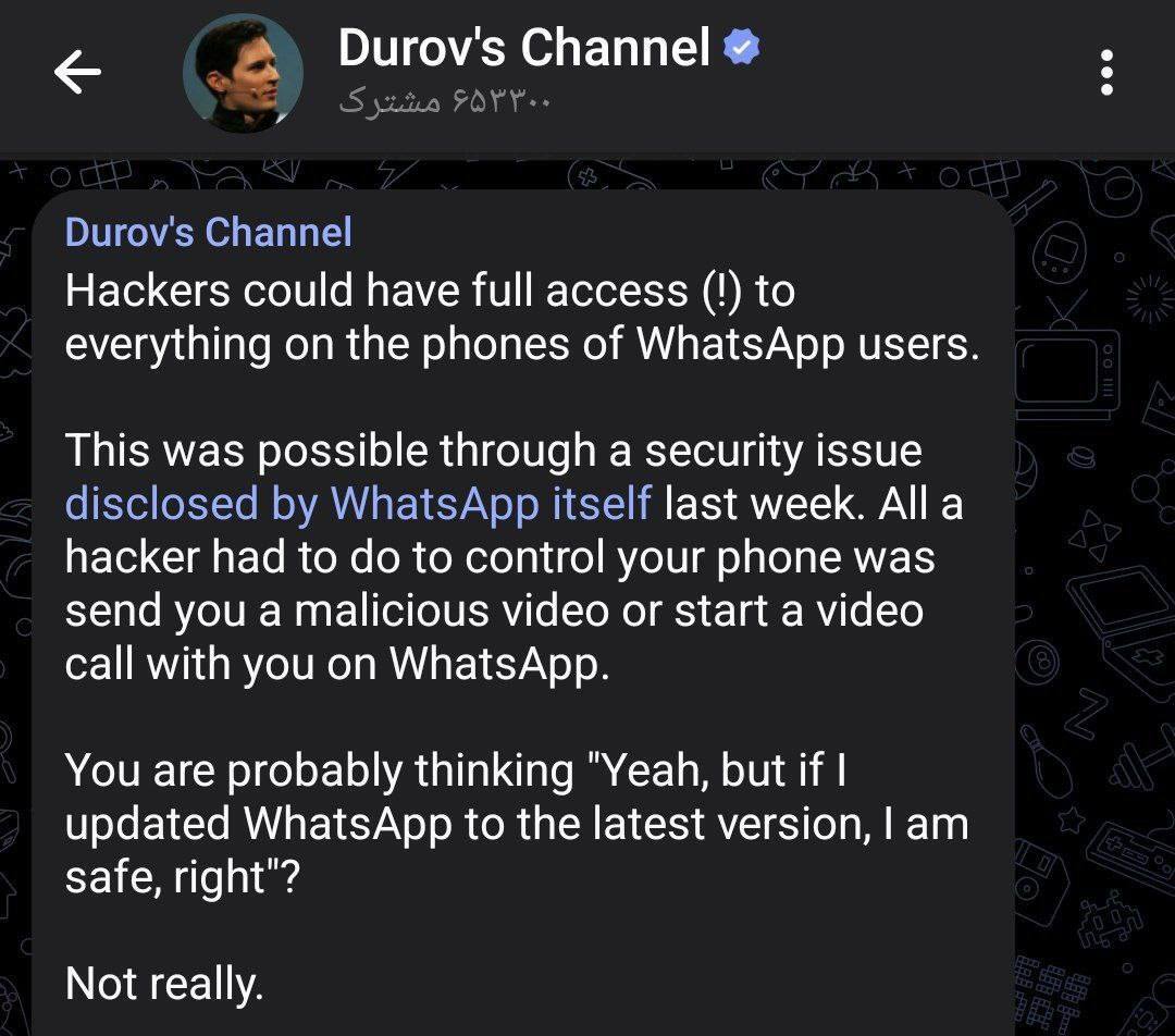 من اینجا به مردم فشار نمیآورم که به تلگرام بروند. با بیش از ۷۰۰ میلیون کاربر فعال و بیش از ۲ میلیون ثبت نام روزانه، تلگرام نیازی به تبلیغات اضافی ندارد. میتوانید از هر برنامه پیامرسانی که دوست دارید استفاده کنید، اما از واتساپ دوری کنید – اکنون ۱۳ سال است که یک ابزار نظارتی است.»