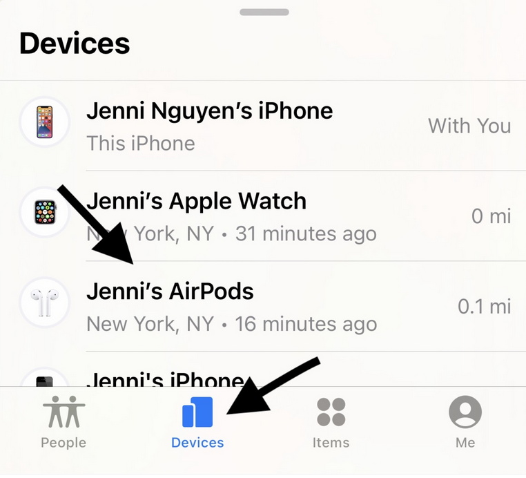 ۱. یک بار دیگر به برنامه Find My بروید. مطمئن شوید که در تب Devices هستید و روی AirPods در لیست ضربه بزنید.