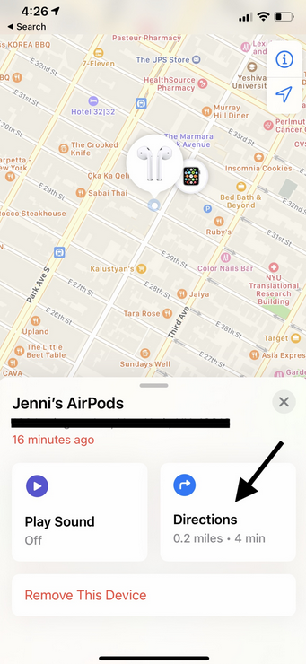 ۳. روی دستگاه کلیک کنید تا آخرین مکان شناخته شده آن را روی نقشه ببینید. اگر میخواهید مسیر خود را مستقیما به آن مکان نقشه برداری کنید، روی «جهتها» ضربه بزنید؛ این یک شانس برای یافتن ایرپاد گمشده شما است.