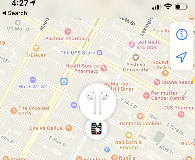 از آن جایی که غلافها در جعبه قرار دارند، نمیتوانید از بلندگوهای آنها برای پخش صدا و ردیابی استفاده کنید. با این حال، میتوانید آخرین مکان آنلاین آنها را روی نقشه مشاهده کنید. جایی که آنها را از جعبه خود خارج کردهاید که امیدواریم جایی باشد که آنها را گم کردهاید. این روش برای یافتن ایرپاد خاموش هم موثر بوده و آخرین مکان آنلاین آنها را زمانی که آنها روشن بوده اند، نشان میدهد.