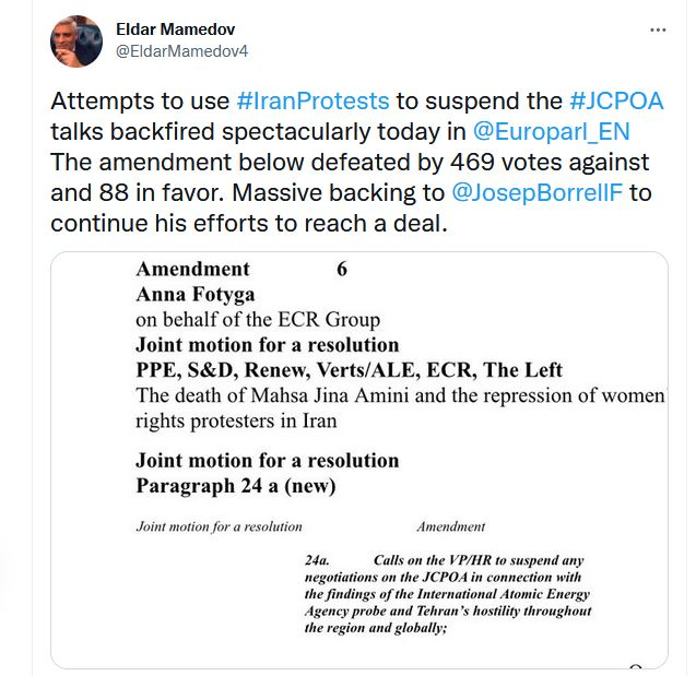 تلاش برخی قانونگذاران پارلمان اروپا برای توقف مذاکرات برجامی اتحادیه اروپا با ایران به دلیل اغتشاشات اخیر، با مخالفت اکثریت نمایندگان اروپایی مواجه شد.