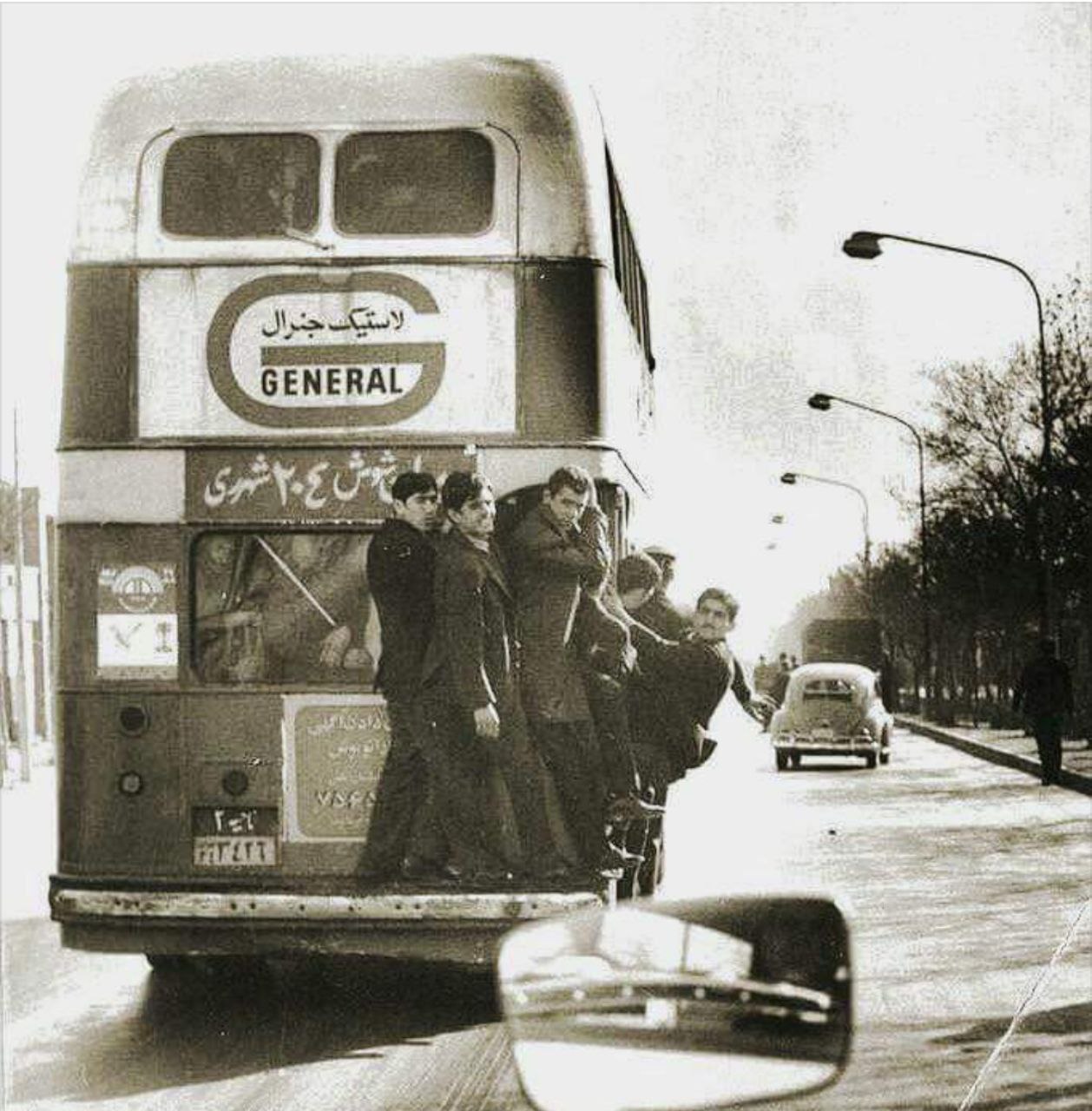 در این تصویر که در دهه ۵۰ هجری شمسی گرفته شده شلوغی زیاد باعث شده است برخی مسافران آویزان از اتوبوس باشند.