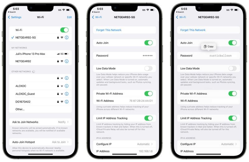 در ادامه گزینه Password را انتخاب کنید. برای دستیابی به پسورد، باید هویت خود را با استفاده از تاچ آیدی، فیس آیدی یا پسورد تایید کنید. پس از این کار، رمز وای فای در اختیارتان قرار میگیرد و میتوانید آن را با دیگران به اشتراک بگذارید.