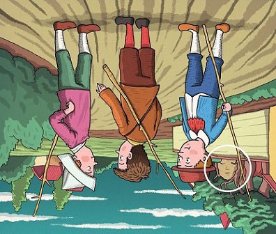 به این تصویر از نزدیک نگاه کنید و سعی کنید چهره مرد را در داخل تصویر ببینید. اگر هنوز نتوانستید پاسخ را بیابید، تصویر را وارونه کنید، اینگونه میتوانید مردی را که در نزدیکی سه پسر پنهان شده است، ببینید. اگر به سمت راست تصویر نگاه کنید، چهره مرد پشت درخت پنهان شده است.