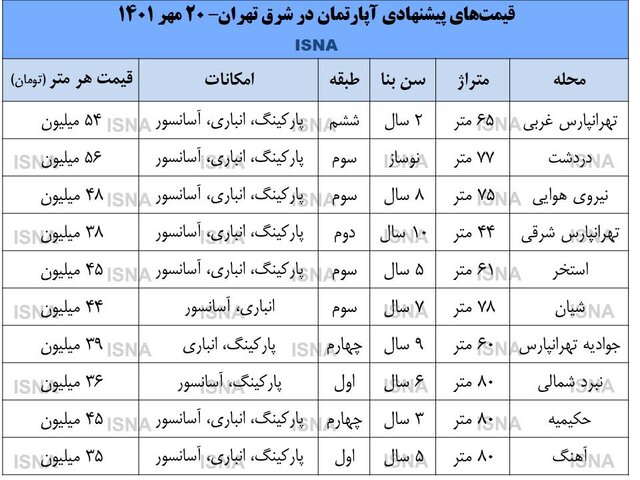 بالاترین و پایین ترین قیمت مسکن در شرق تهران + جدول