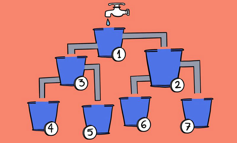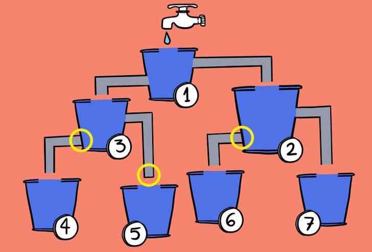 نکته: به لولههایی که سطلها را به هم متصل میکنند نگاه کنید که از طریق آنها آب به سطلهای مختلف ریخته میشود.