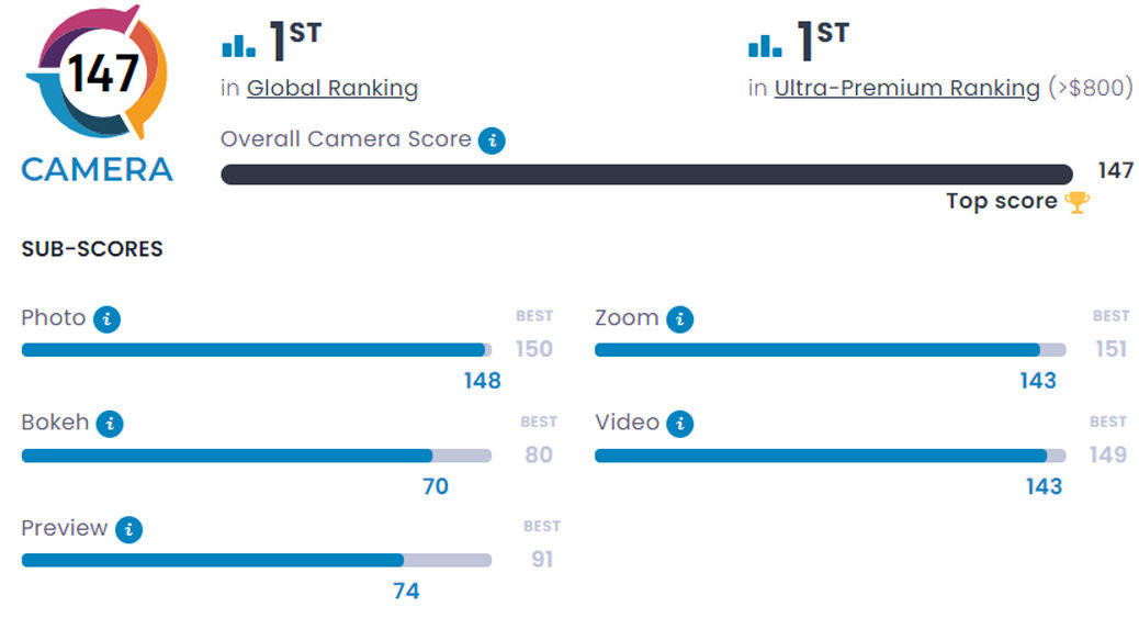 پیکسل ۷ پرو با امتیاز کلی ۱۴۷ بهصورت مشترک با آنر مجیک ۴ آلتیمیت در رتبهی نخست رنکینگ جهانی DXOMark و رتبهی نخست رنکینگ گوشیهای فوق پریمیوم (محصولاتی با قیمت بالای ۸۰۰ دلار) قرار گرفته است و جایگاه بالاتری نسبتبه پرچمداران سایر برندها دارد. پس از این دو گوشی، آیفون ۱۴ پرو با امتیاز ۱۴۶ بهتر از گوشیهای سایر برندها است.