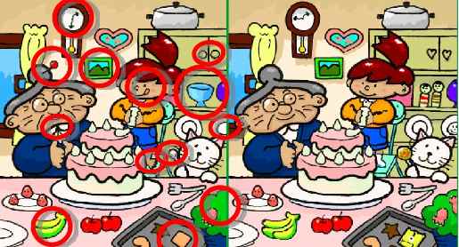 تعداد موزها ، رنگ کوکی ، جوراب کودک ، تعداد آب نبات ، گربه ، زمان ساعت ، تصویر روی دیوار، چهره بچه ، سنجاق سر در موهای مادربزرگ ، اشیاء مختلف در قفسه