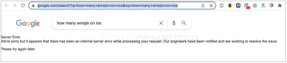 وقتی کاربران جملهای خاص مثل «How many emojis on Apple» را در موتور جستجوی گوگل جستجو میکنند، پس از تایماوت پیغام خطای سرور در صفحه نمایش داده میشود.