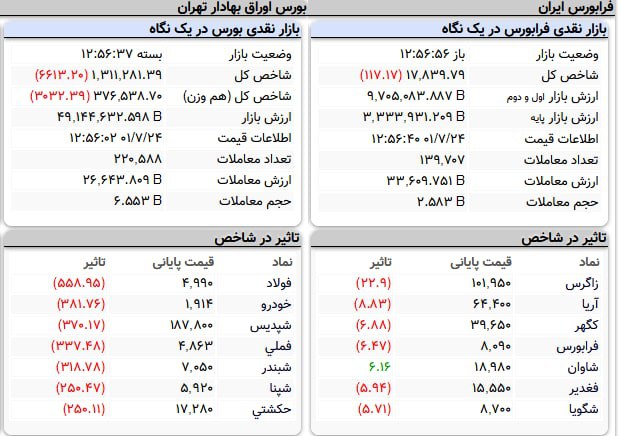 شاخص فرابورس نیز امروز بیش از ۱۱۷ واحد کاهش داشت و به ۱۷ هزار و ۸۳۸ واحد رسید.