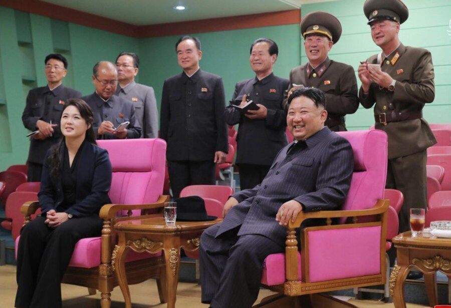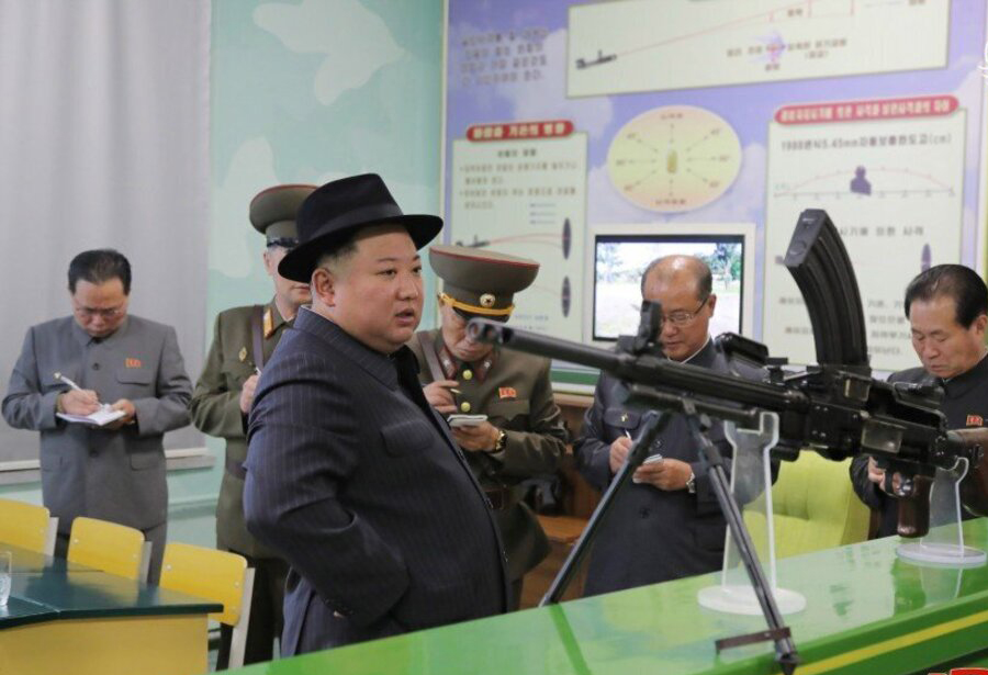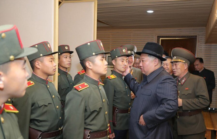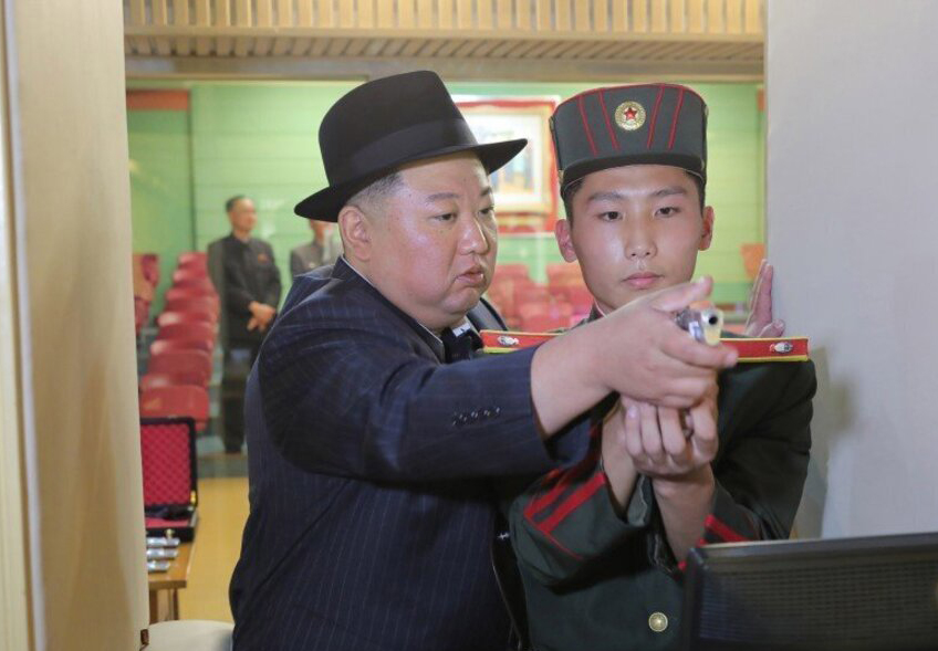 تصاویر دیگر کیم را نشان میداد که کت و شلوار راه راه و کلاه سیاه پوشیده بود و به سربازان آموزش تیراندازی دقیق با اسلحه و بررسی تجهیزات نظامی را میداد.