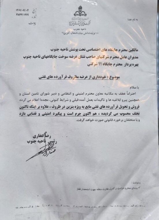 چند روزی است که تصویری از ابلاغیه به پمپ بنزین ها در فضای مجازی منتشر شده که طبق آن فروش بنزین در ظروف را جرم دانسته و در صورتی که جایگاه داران بخواهند به مردم در ظرف بنزین بفروشند، تخلف از دستور تلقی خواهد شد و پیگرد امنیتی و قضایی دارد.