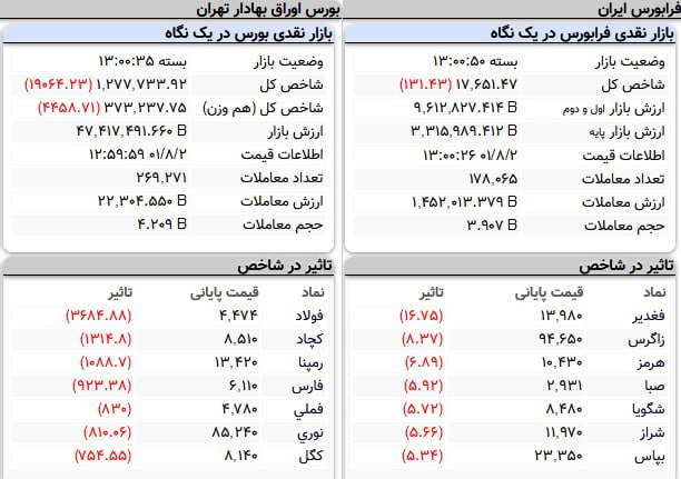 شاخص کل فرابورس هم ۱۳۱ واحد کاهش یافت و تا رقم ۱۷ هزار و ۶۵۱ واحد سقوط کرد.