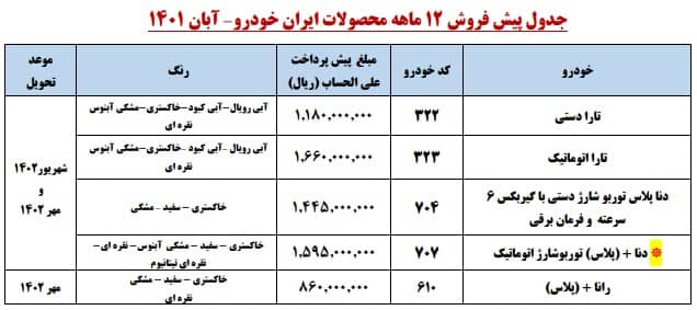 ایران خودرو در ادامه طرحهای پیش فروش محصولات خود قصد دارد رانا پلاس، تارا دستی، تارا اتوماتیک، دنا پلاس توربوشارژ دستی و اتوماتیک را در قالب طرح پیش فروش با تحویل حداکثر ۱۲ ماهه از روز پنجشنبه ۵ آبان ۱۴۰۱ به مدت ۴ روز در سایت فروش اینترنت محصولات خود با قرعه کشی به فروش برساند. در این طرح تمام محدودیتهای قبلی اعمال میشود. در ادامه جزئیات شرایط فروش این خودروها را مشاهده میکنید: