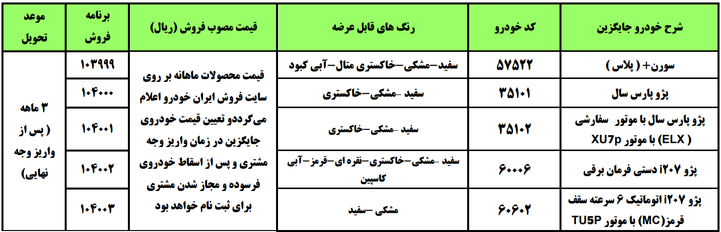 فروش فوری ایران خودرو در طرح جایگزینی خودروهای فرسوده غیرتاکسی برای آبان ماه با عرضه ۵ خودرو آغاز شده است. در این طرح خودروهای سورن پلاس، پژو پارس سال، پژو پارس با موتور سفارشی XU7p، پژو ۲۰۷ دستی و پژو ۲۰۷ اتوماتیک عرضه شده اند. قیمت خودروها در این طرح قطعی و موعد تحویل آن ۳ ماه پس از واریز وجه نهایی است.