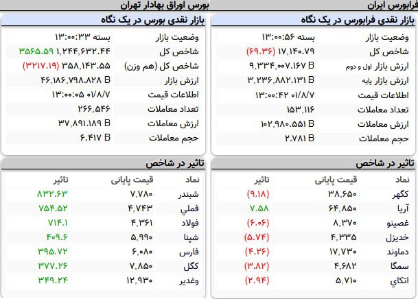 پلیمر آریاساسول (آریا)، پالایش نفت شیراز (شراز)، فرابورس ایران (فرابورس)، داروسازی دانا (ددانا) و فرآروده های غذایی و قند چارمحال (قچار) و پالایش نفت لاوان (شاوان) با تاثیر مثبت بر شاخص فرابورس همراه بودند، همچنین سنگ آهن گهرزمین (کگهر)، صنعتی مینو (غصینو)، بهمن دیزل (خدیزل)، تولید نیروی برق دماوند (دماوند) و گروه سرمایه گذاری میراث فرهنگی (سمگا) تاثیر منفی بر این شاخص داشتند.