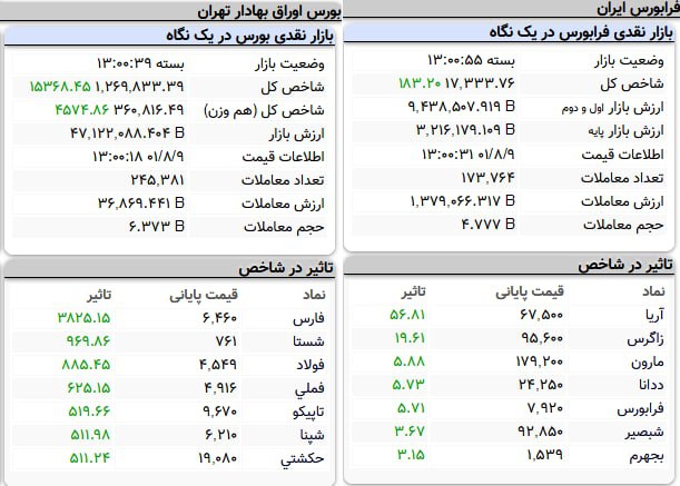 در فرابورس ایران هم شاخص کل امروز با 181 واحد افزایش نسبت به روز قبل به رقم 17 هزار و 332 واحد رسید. ارزش بازار اول و دوم فرابورس ایران 943 هزار میلیارد تومان شد.
