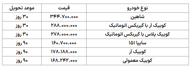 گروه خودروسازی سایپا در ادامه طرحهای فروش محصولات خود قصد دارد از ساعت ۱۱ روز چهارشنبه ۱۱ آبان ۱۴۰۱ خودروهای شاهین، کوییک آر با گیربکس اتوماتیک، کوییک پلاس با گیربکس اتوماتیک، سایپا ۱۵۱، کوییک آر و کوییک معمولی را به فروش برساند. در ادامه جزئیات شرایط فروش محصولات سایپا در آبان ۱۴۰۱ را مشاهده میکنید:
