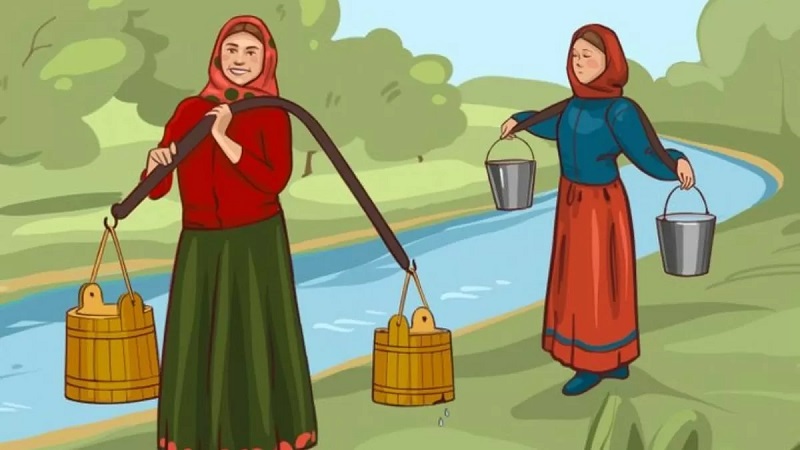 اگر به سطل های داخل تصویر دقت کنید متوجه می شوید که سطل های خانم جلویی کمی بزرگتر و چوبی است. سطل های خانم عقبی استیل و کمی کوچک است. اما یکی از سطل های خانم جلویی چکه می کند و آب از آن می چکد. بنابراین تا زمانی که به خانه برسد سطل او خالی می شود.