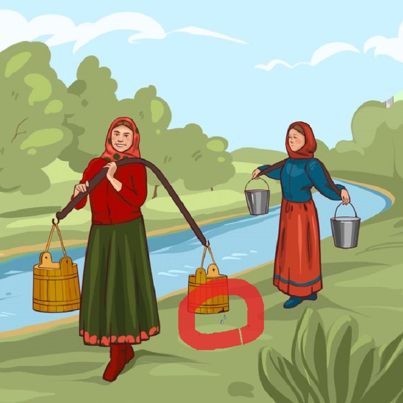 اگر به سطل های داخل تصویر دقت کنید متوجه می شوید که سطل های خانم جلویی کمی بزرگتر و چوبی است. سطل های خانم عقبی استیل و کمی کوچک است. اما یکی از سطل های خانم جلویی چکه می کند و آب از آن می چکد. بنابراین تا زمانی که به خانه برسد سطل او خالی می شود.