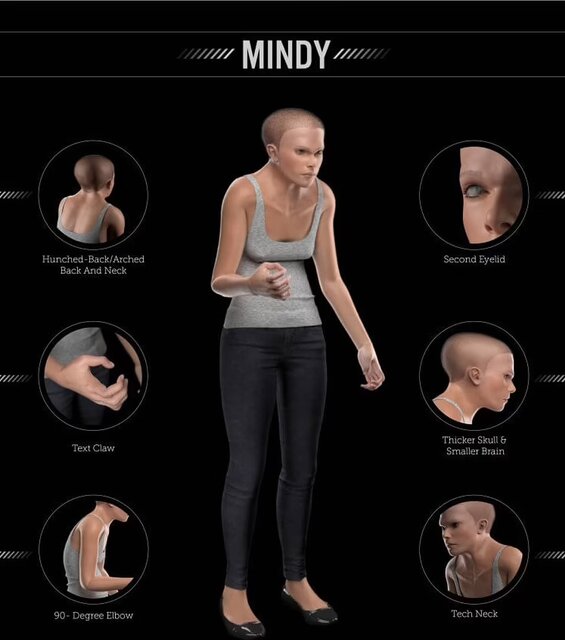 یک پروژه پژوهشی هشدار میدهد که استفاده بیش از حد از فناوری میتواند ناهنجاریهایی در بدن ما ایجاد کند. پژوهشگران با یک طراح سهبعدی برای ساختن تصاویری از "انسان آینده" همکاری کردند که مشکلات مربوط به فناوری را در استفاده روزانه از آن نشان میدهد. پژوهشگران نام این مدل سه بعدی را میندی(Mindy) گذاشتند.