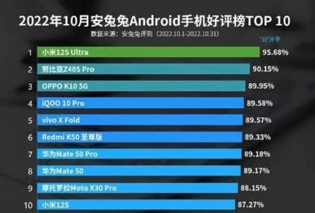 پلتفرم بنچمارک شناخته شده آنتوتو، فهرستی از رضایت بخش ترین گوشی های اندرویدی جهان در ماه اکتبر را منتشر کرد. گردآوری این دادهها طی ماه گذشته میلادی و در چین انجام شده است. در این لیست، گوشی شیائومی ۱۲ اس اولترا با رضایتمندی 95.68 درصدی در رتبه اول قرار گرفت. گوشی نوبیا Z40S پرو با درصد رضایتمندی 90.15 در رتبه دوم و اوپو K10 5G نیز با 89.95 درصد رده سوم را به خود اختصاص داد.