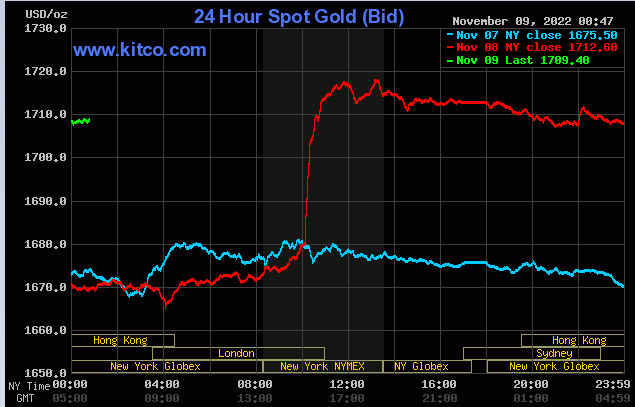 قیمت هر اونس طلا امروز در لحظه تنظیم این گزارش با 39 دلار افزایش به 1710 دلار رسید.