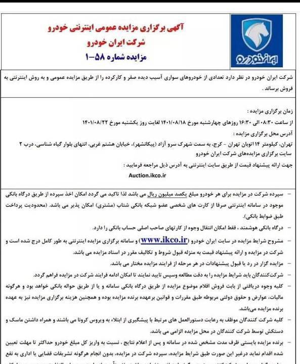 شرکت خودروسازی ایرانخودرو در نظر دارد تعدادی از خودروهای آسیب دیده صفر و کارکرده را از طریق مزایده عمومی به روش اینترنتی بفروش برساند.
