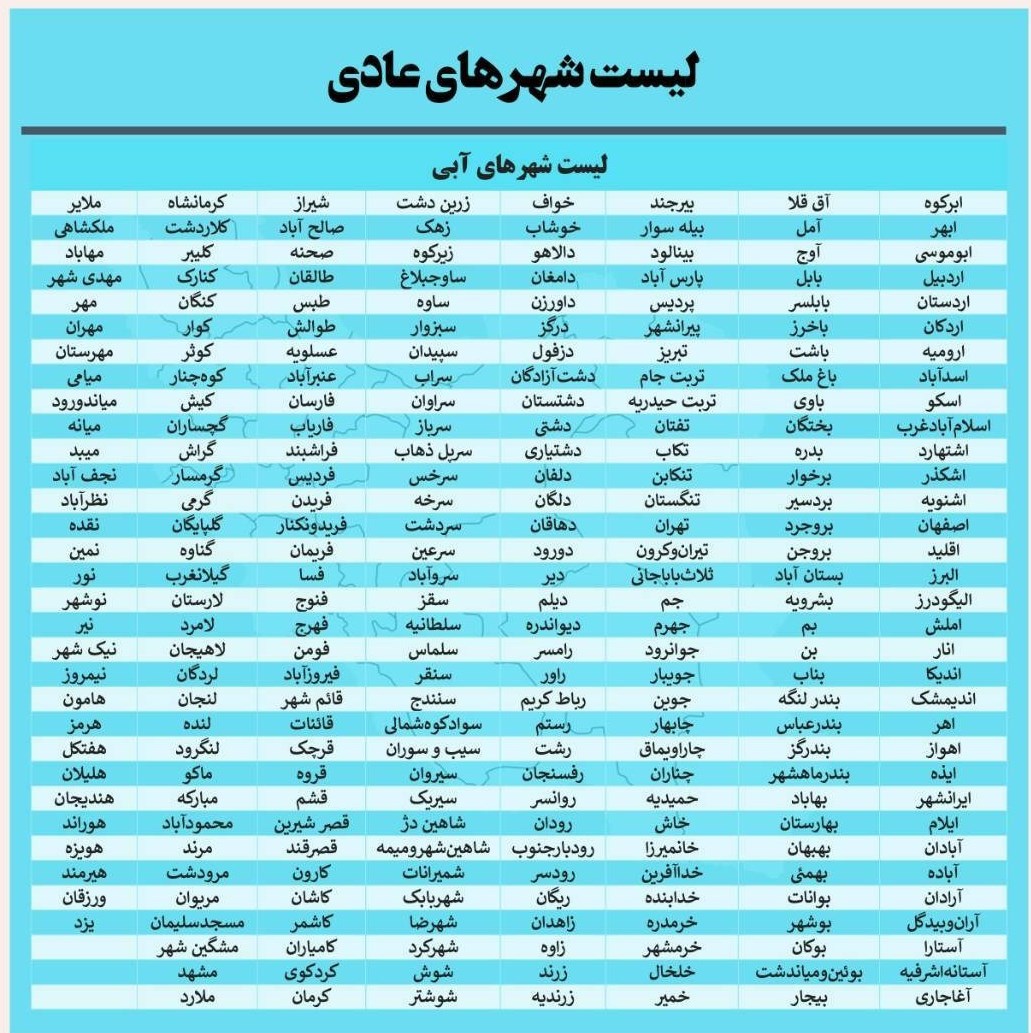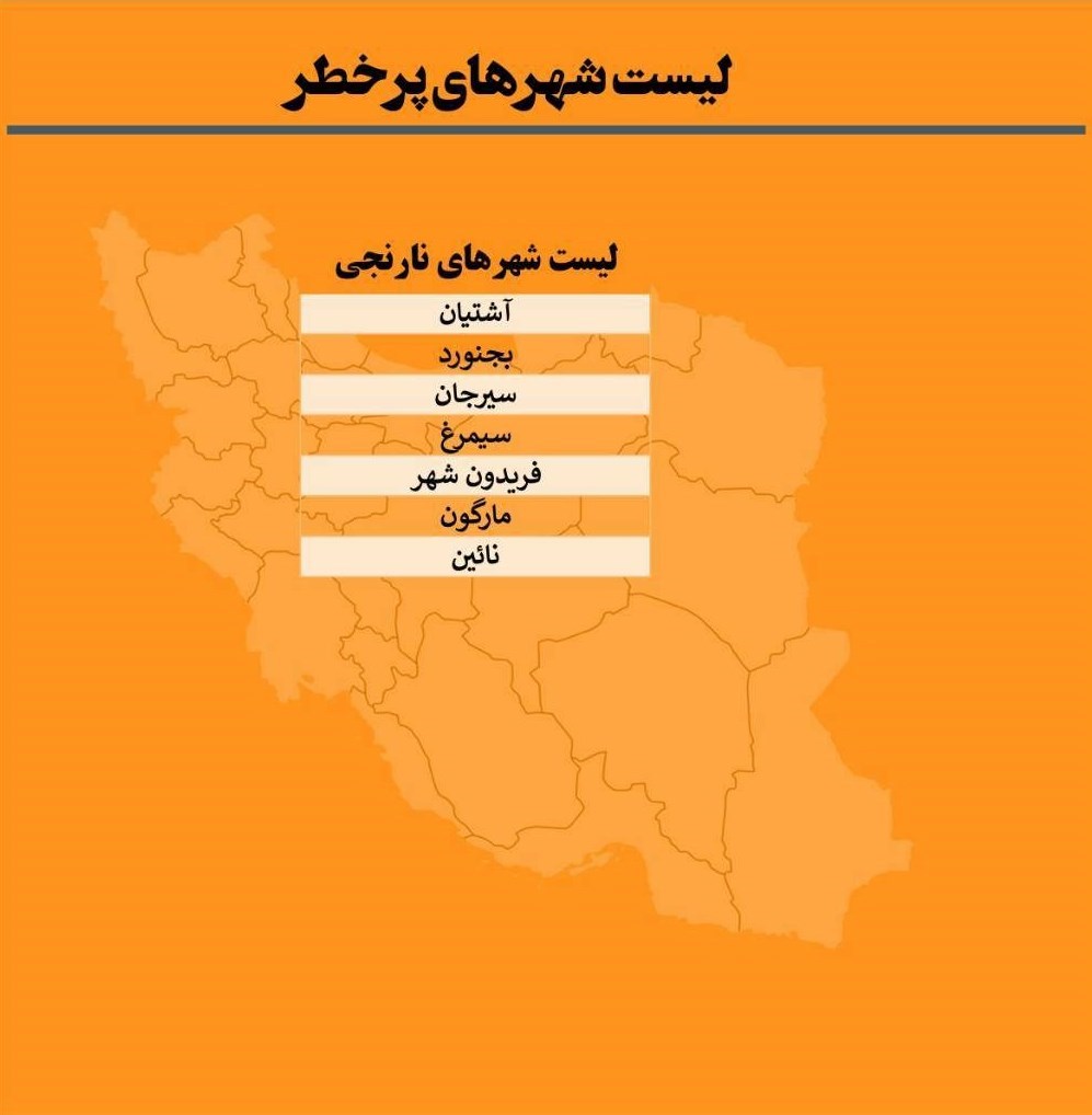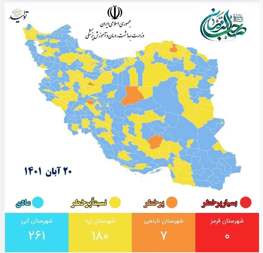 هیچ شهری در وضعیت قرمز کرونا قرار ندارد؛ اسامی هفت شهرستان نارنجی، 180 شهر زرد و 261 شهر آبی در تصاویر زیر آمده است: