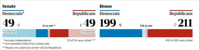 گرچه جمهوریخواهان اکنون پیشتاز هستند، اما عملکرد آنها از آنچه فکر میکردند، ضعیفتر بوده است. تا قبل از انتخابات، پیشبینی میشد که حزب جمهوریخواه با اکثریت نسبتا قاطعی کنترل مجلس نمایندگان را به دست بگیرد، اما خروجی صندوقها حکایت از چنین قطعیتی ندارد.