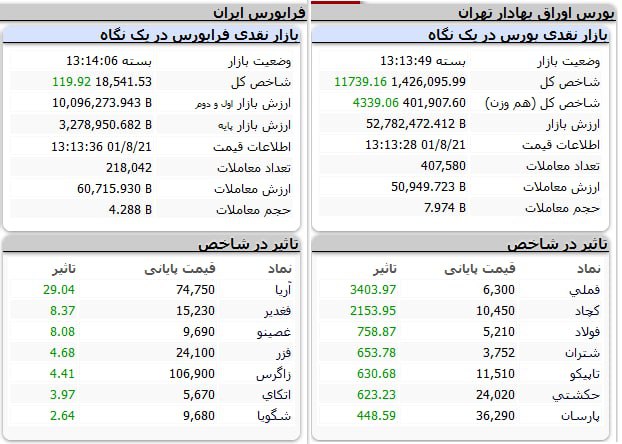 در این بازار هم امروز بیشترین اثر مثبت بر شاخص فرابورس به نام نمادهای معاملاتی پلیمر آریا ساسول، آهن و فولاد غدیر ایرانیان و صنعتی مینو شد و در مقابل شرکتهای صنایع پتروشیمی تخت جمشید، پالالش نقت لاوان و سرمایهگذاری مالی سپهر صادرات بیشترین اثر منفی را بر این شاخص به نام خود ثبت کردند.