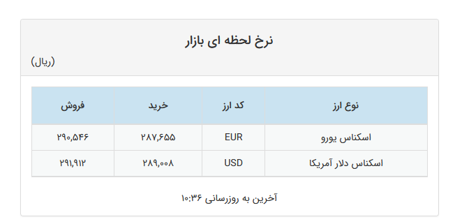 علاوه بر این، نرخ خرید اسکناس دلار در بازار متشکل ارزی ۲۸ هزار و ۶۶۹ تومان و نرخ فروش آن ۲۸ هزار و ۹۳۰ تومان اعلام شد. نرخ خرید یورو ۲۶ هزار و ۶۲۹ تومان و نرخ فروش آن ۲۹ هزار و ۸۹۸ تومان اعلام شد.